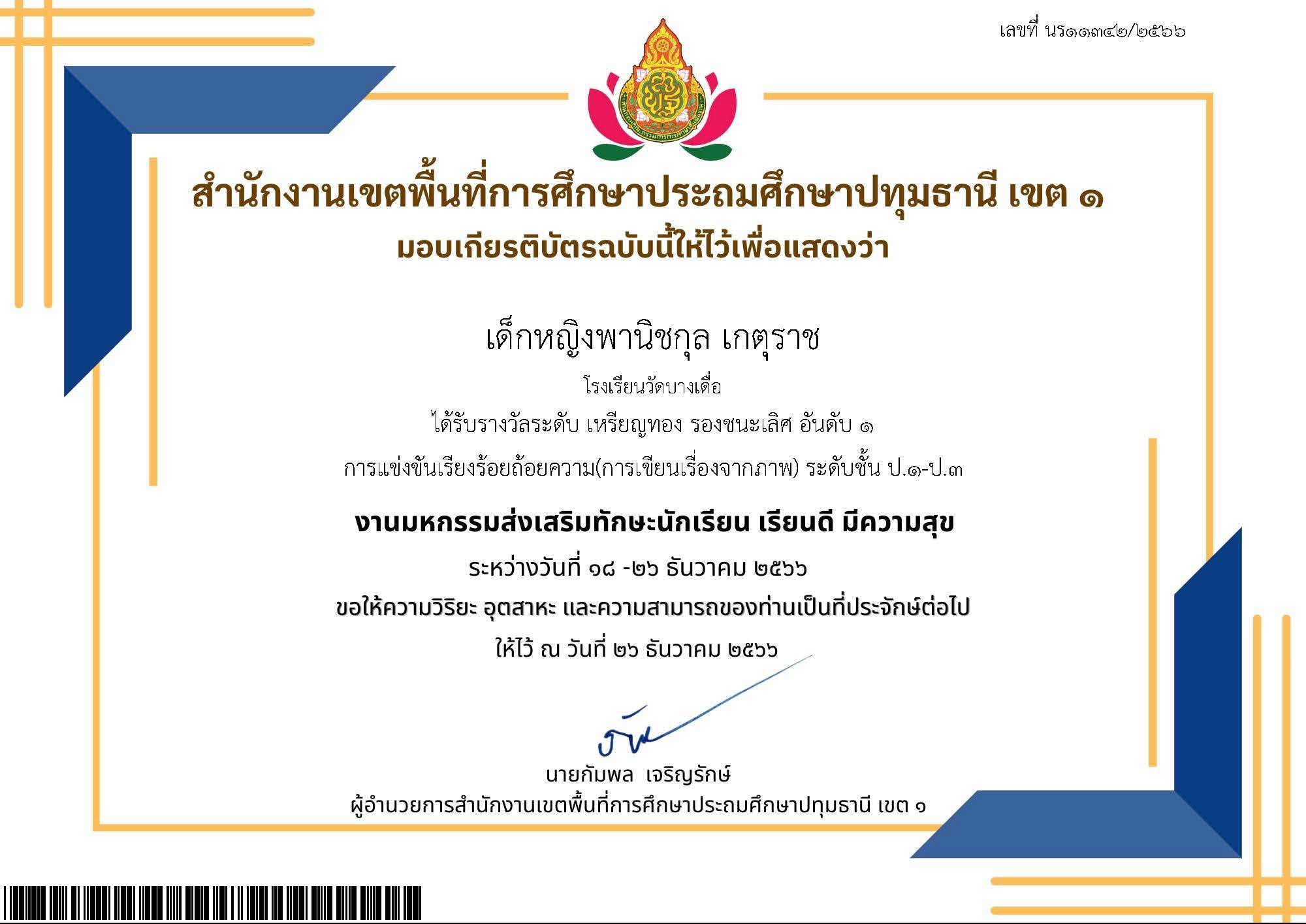 รองชนะเลิศ อันดับ 1 การแข่งขันเรียงร้อยถ้อยความ(การเขียนเรื่องจากภาพ) ระดับชั้น ป.1-ป.3