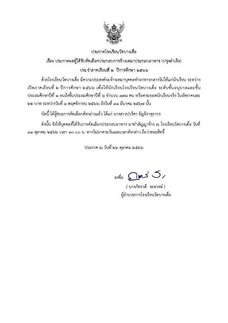 ประกาศผลผู้ได้รับคัดเลือกประกอบการจ้างเหมาประกอบอาหาร (ปรุงสำเร็จ)
