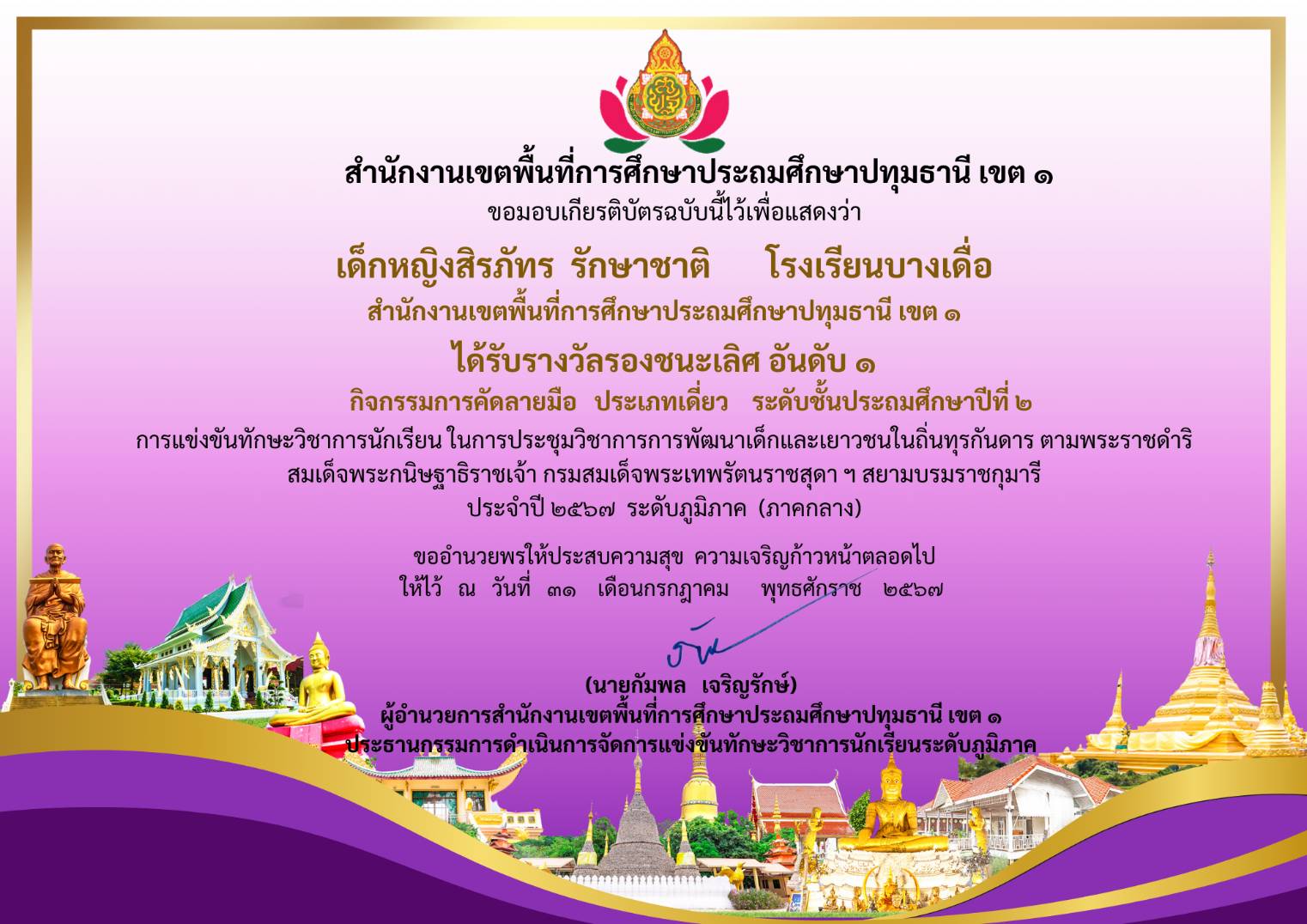 รางวัลรองชนะเลิศ อันดับกิจกรรมการคัดลายมือ ประเภทเดี่ยว